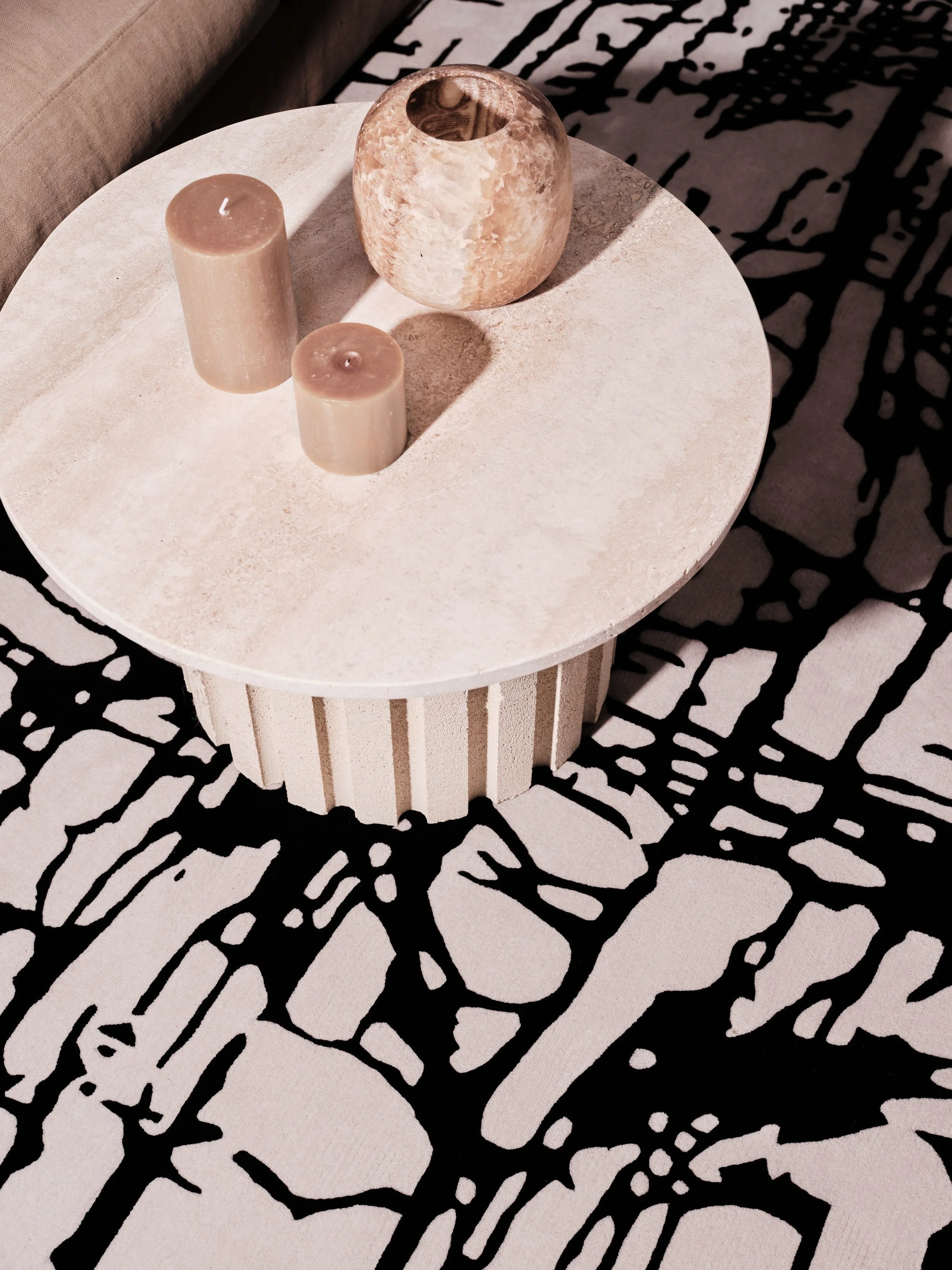 Designed with dramatic contradictions of texture, pattern, and color, this collection embraces imperfection. Destructive and constructive satin lines dance chaotically across plush wool, creating a graphic effect that celebrates irregularity and will enliven any space.