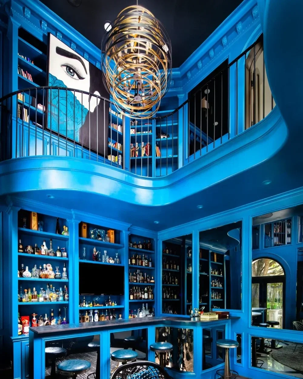 Designed as an immersive entertaining destination, Saddlecreek transforms a two-story home bar into a dramatic, hospitality-inspired environment. Moody color, sculptural lighting, reflective surfaces, and richly layered furnishings create a setting that feels intimate, glamorous, and unapologetically transportive.